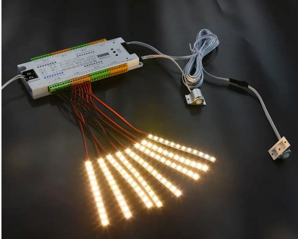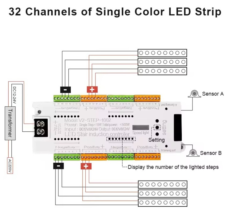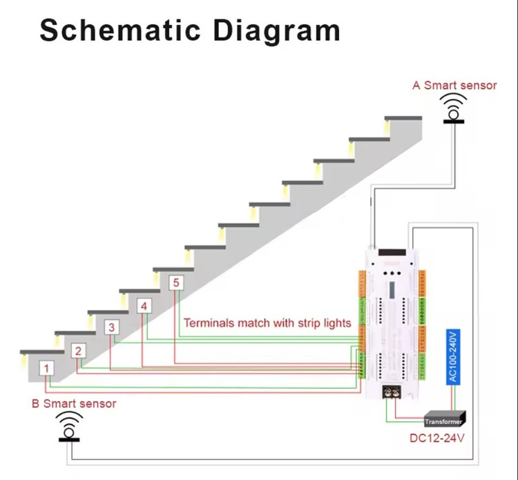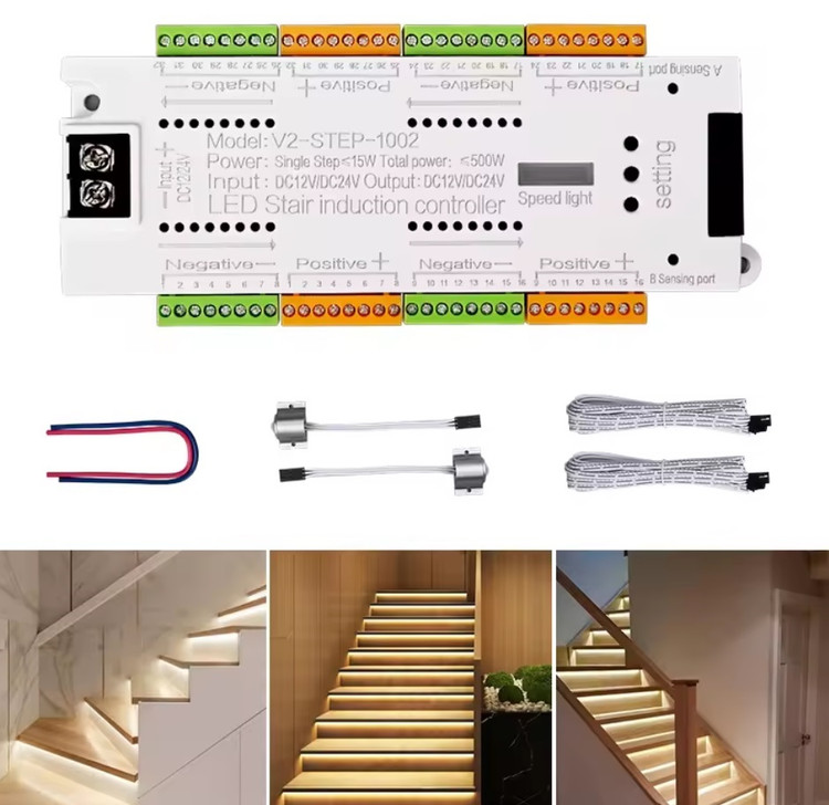 کنترلر هوشمند نور راه پله یک کنترل کننده 32 کانال است که برای روشن و خاموش کردن خودکار نور پله ها به طور جداگانه و ایجاد جلوهای زیبا و متحرک استفاده میشود. این کنترلر دارای 2 عدد سنسور حرکتی PIR است که در بالا و پایین راه پله نصب می شود و با تنظیم تعداد پله ها و سرعت اجرای افکت و نوع افکت می توانید نورپردازی ای زیبا به صورت داینامیک ایجاد نمایید.