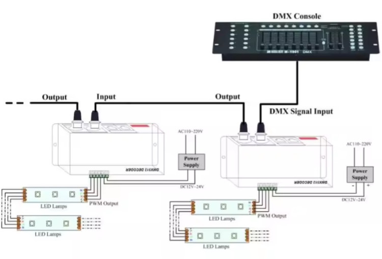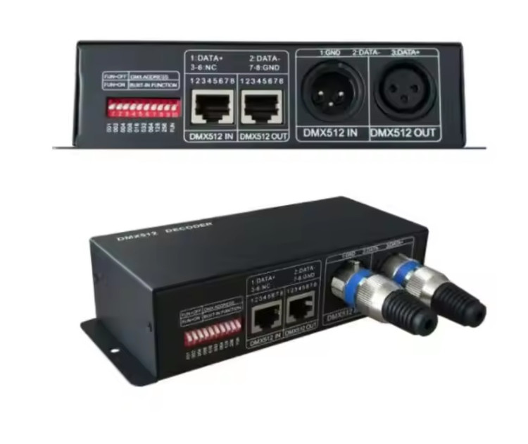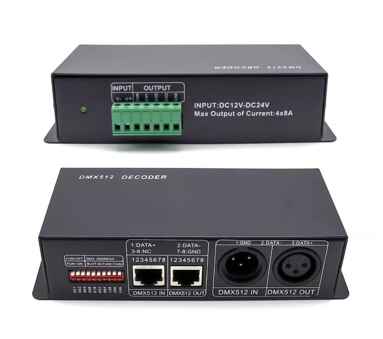 ارسال داده: کنترلر DMX دادههای دیجیتال را به صورت بستههای اطلاعاتی به تجهیزات نورپردازی متصل شده ارسال میکند.( کنترلر DMX512 از یک میکروکنترلر پیشرفته استفاده میکند.سیگنال کنترل دیجیتال استاندارد DMX-512 را دریافت میکند و آن را به سیگنال PWM برای راه ندازی LEDها تبدیل میکند.