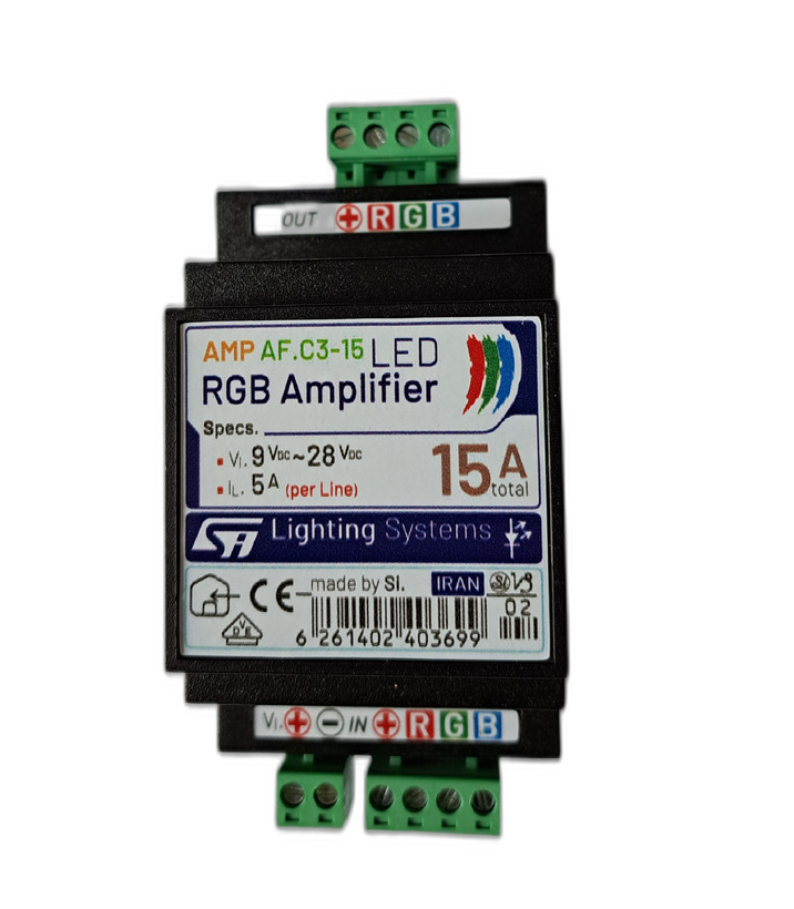 این آمپلی فایر جهت افزایش جریان خروجی فلاشرها و کنترلهای نور پردازی RGB ، برای هر لاین از چراغ های RGB درحالت فلاشری و افکت ها تا 5 آمپر و برای تقویت دیمر و حالت های غیر فلاشری حداکثر 4 آمپر است.